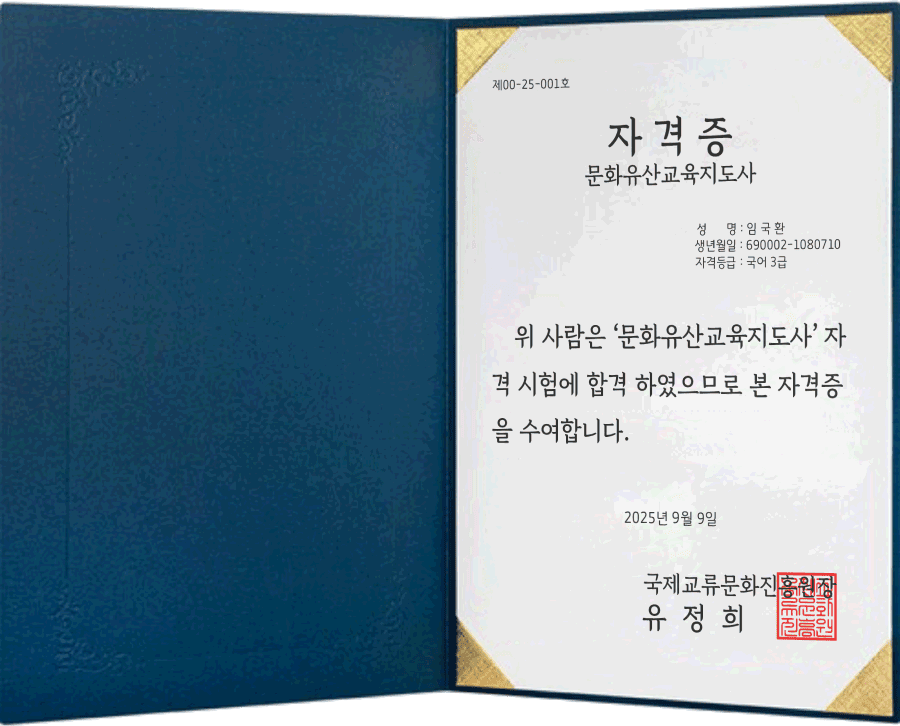 오랫동안 학교 현장에서 역사를 가르쳤지만, 문화유산교육지도사 과정을 통해 ‘지식’ 너머의 ‘가치’를 전달하는 법을 배웠습니다. 현재는 문화관광해설사로 활동하는 동시에, 은퇴 후 새로운 길을 찾는 기업인들에게 우리 문화유산의 지혜를 전하고 있습니다. 이 과정은 제게 단순한 자격증이 아닌, 세상을 읽는 새로운 눈과 두 번째 커리어를 선물해 주었습니다.
